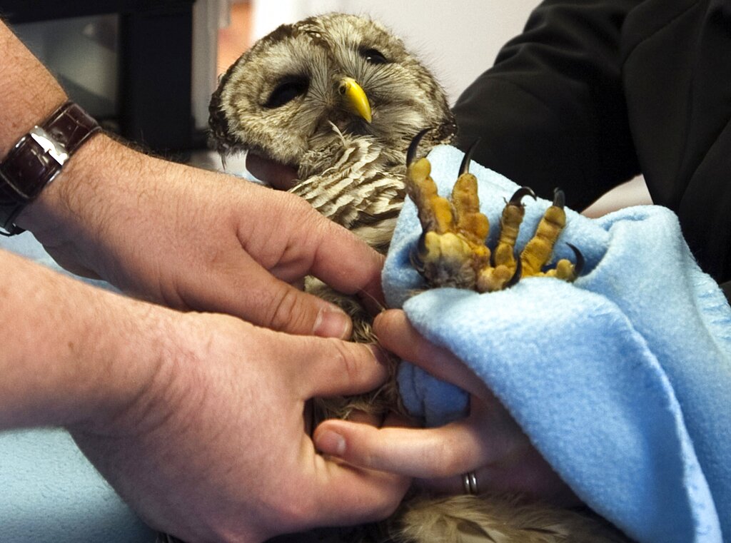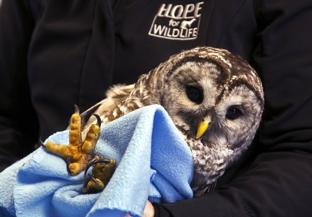 “A barred owl is wrapped in a blanket at Hope for Wildlife rehabiliation and education centre in Seaforth, Nova Scotia. The owl was caught in a rabbit snare and is being treated for a damaged leg. Hope for Wildlife has opened the province’s first wildlife veterinary hospital which will allow injured animals to receive complete medical care without being transported off site. ”