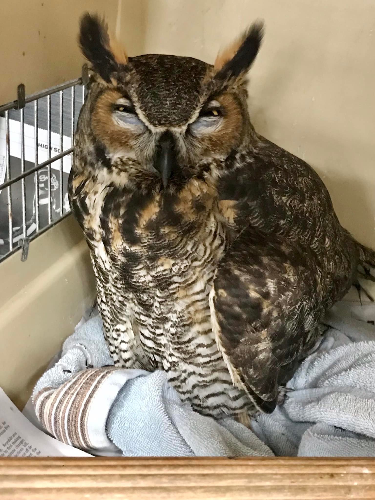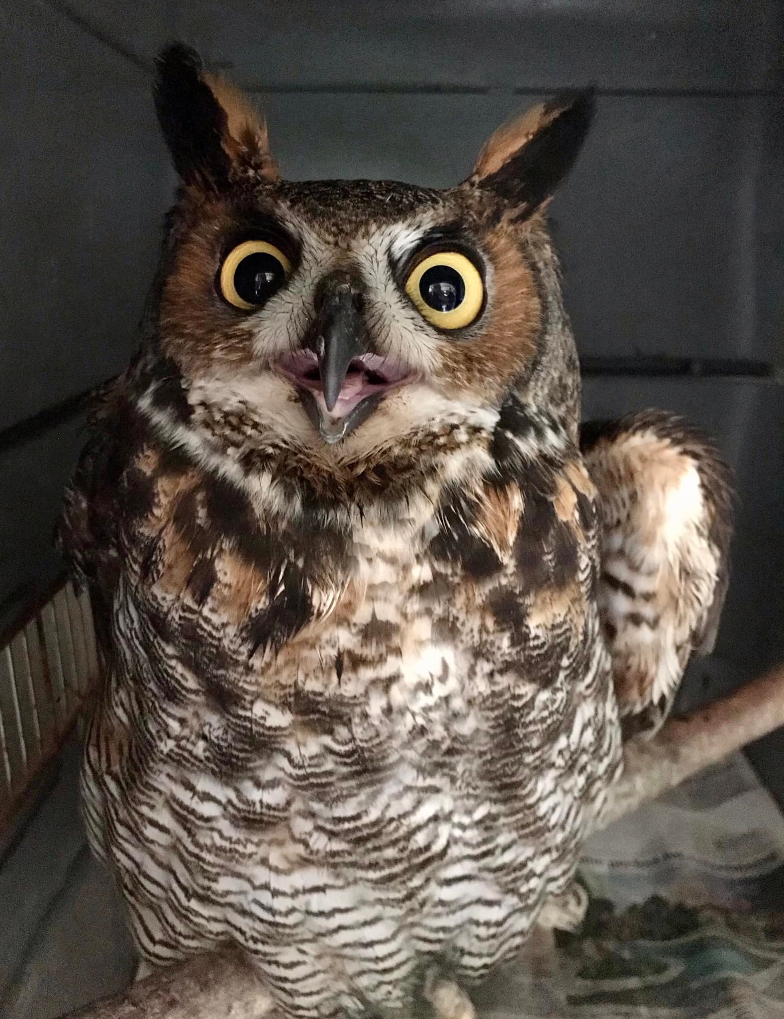 “This poor guy needs your positive vibes, prayers, whatever you have! We suspect some type of toxicity and are treating accordingly. Great horned owl, found down and unable to fly. He’s extremely weak and emaciated.”
