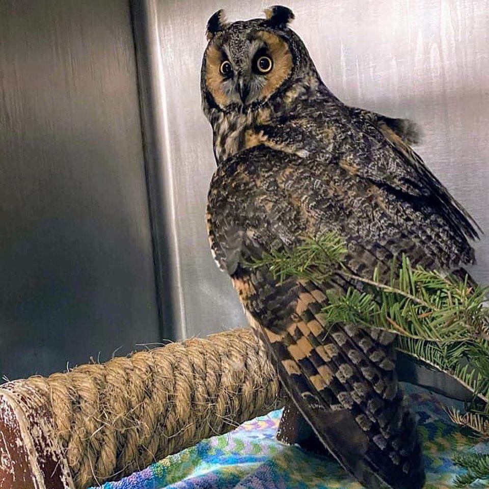”Our long-eared owl patient, who could blend right into the bark of a tree, has head and eye trauma injuries consistent with a collision. We are seeing improvement in the inflammation of her eyes. That startled look is typical for this species, which looks like a smaller, skinny great horned owl.